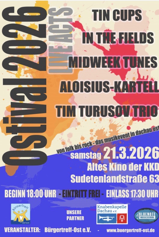 Tim Turusov Trio beim Ostival in DachauNach dem Motto „Das Beste zum Schluß“ ist das Tim Turusov Trio die letzte Band und spielt ca. 21.20h.mit Matthias Huber (sax, composition)Alexandra Fischer (keys, vocals)und Tim Turusov (git, composition)Screenshot